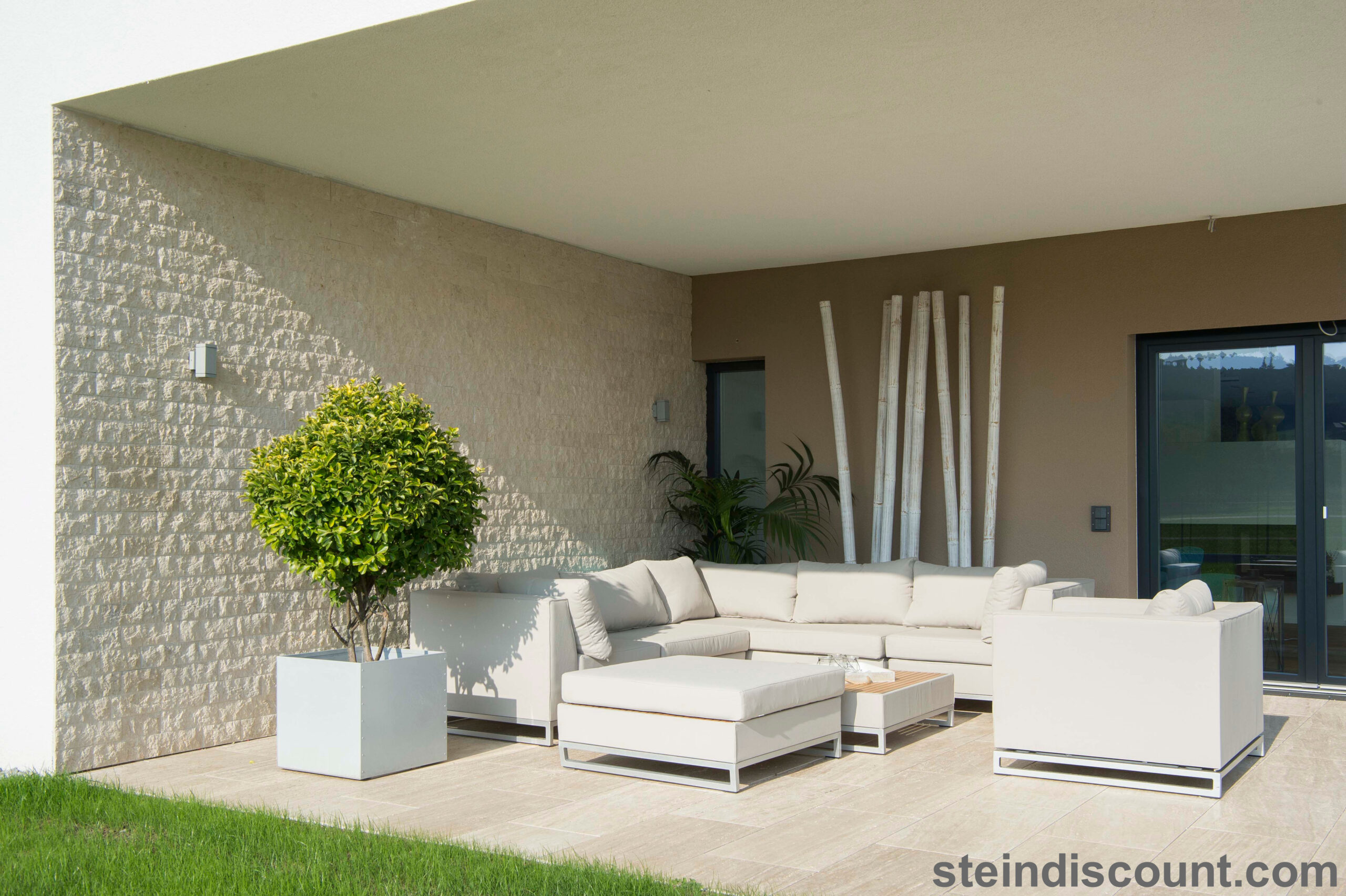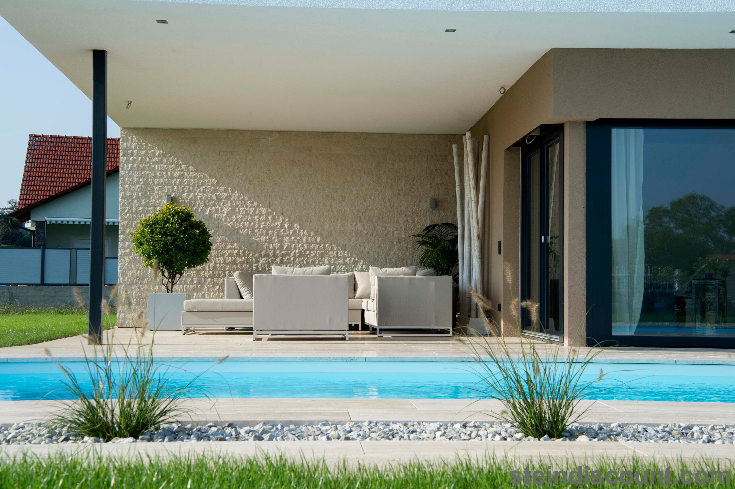Ein optisch sehr warmer, ansprechender, mediteraner Stein der trotz größter Hitze kühl bleibt und sich beim Barfuß begehen gut anfühlt.